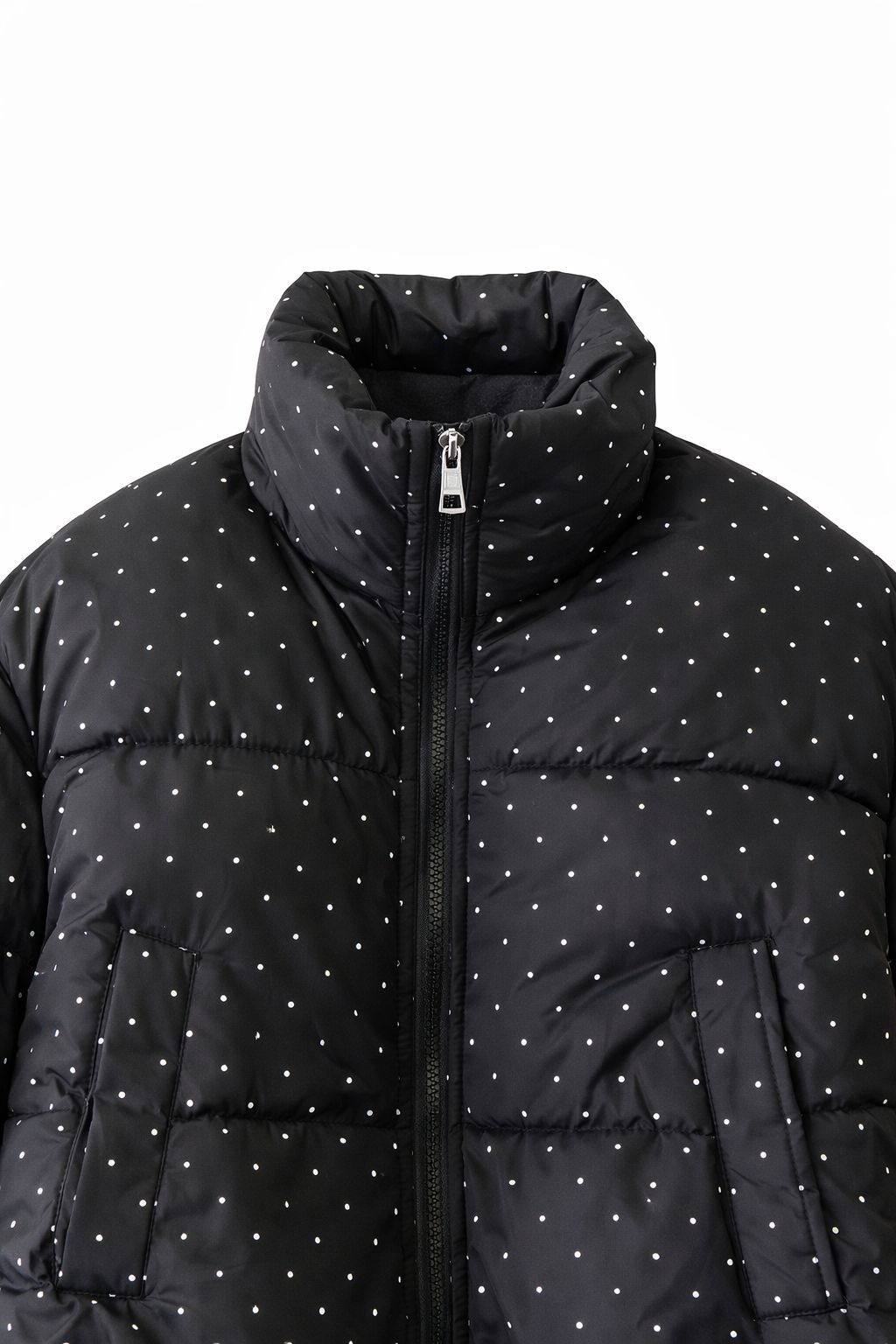 A modern winter essential, this black cropped puffer jacket combines warmth with a stylish edge. Designed with a subtle white polka dot pattern, it adds a playful yet chic touch to a classic silhouette.