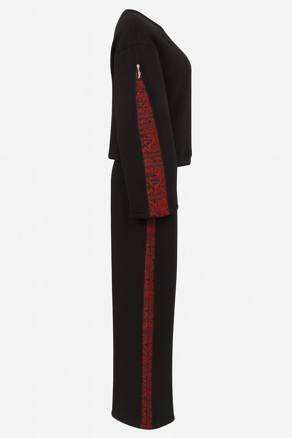 A stylish black training set made from soft, comfortable fabric, featuring traditional Palestinian red embroidery along the sleeves and down the sides of the pants. A modern design that blends comfort with authentic heritage, perfect for daily wear or occasions that celebrate Palestinian identity.