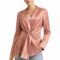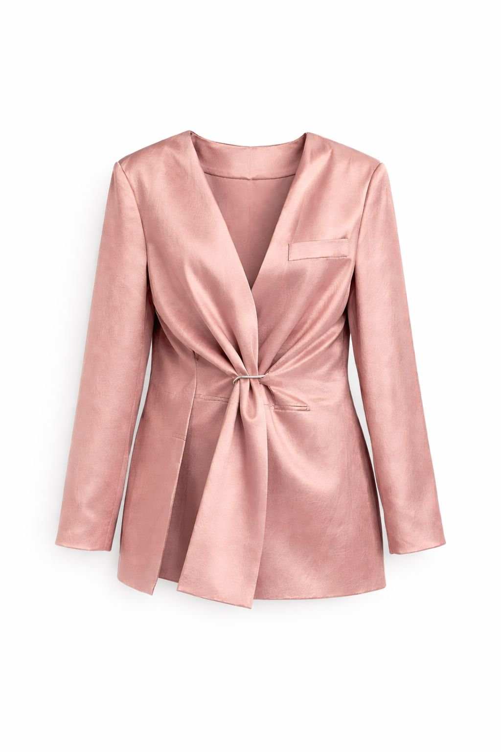 Crafted in a delicate blush pink tone with a subtle satin sheen, this tailored blazer features a deep V-wrap front that creates a flattering, elongating effect. The gathered waist detail with a sleek metallic accent enhances the silhouette, giving structure while maintaining elegance.