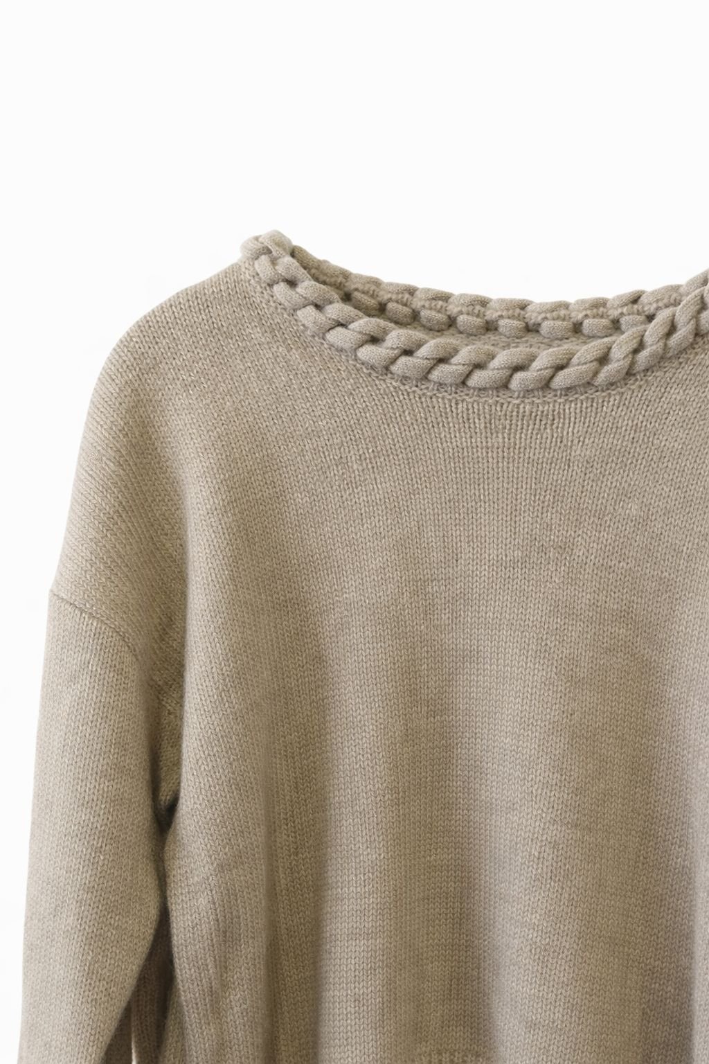 A timeless knit sweater designed with understated elegance. Crafted from soft, cozy yarn in a warm oat-beige tone, this sweater features a relaxed silhouette and a distinctive braided neckline detail that adds a refined, artisanal touch. Finished with ribbed cuffs and hem for a comfortable fit, it’s perfect for effortless everyday styling—whether paired with jeans for a casual look or layered over tailored pieces for a chic, cozy outfit.