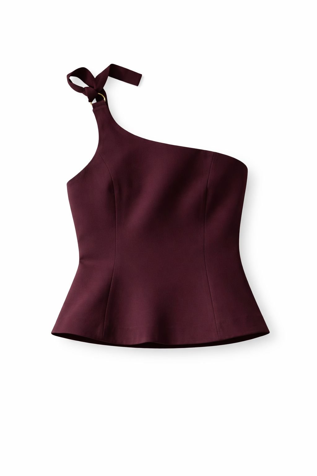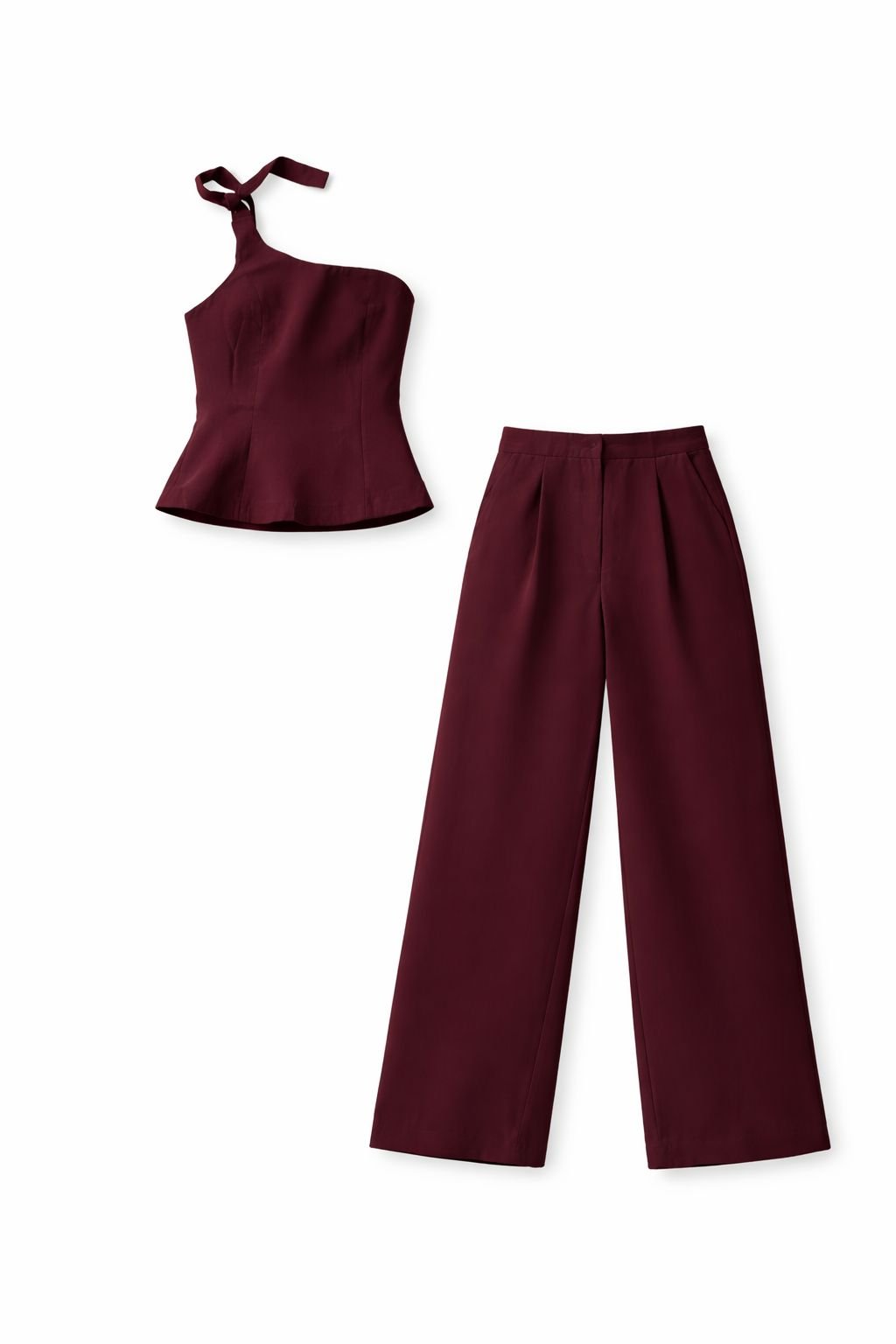 Crafted in a rich deep burgundy tone, this two-piece set features a structured one-shoulder top with a delicate tie detail at the shoulder, adding a modern and feminine touch. The tailored silhouette enhances the waist, creating a flattering and sculpted fit.