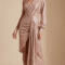 قماش بلمعة Rose Gold ناعمة يعكس الضوء بشكل راقي جداً، مع فتحة جانبية تضيف حركة وأناقة بدون مبالغة.