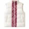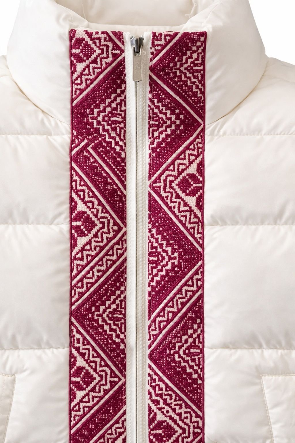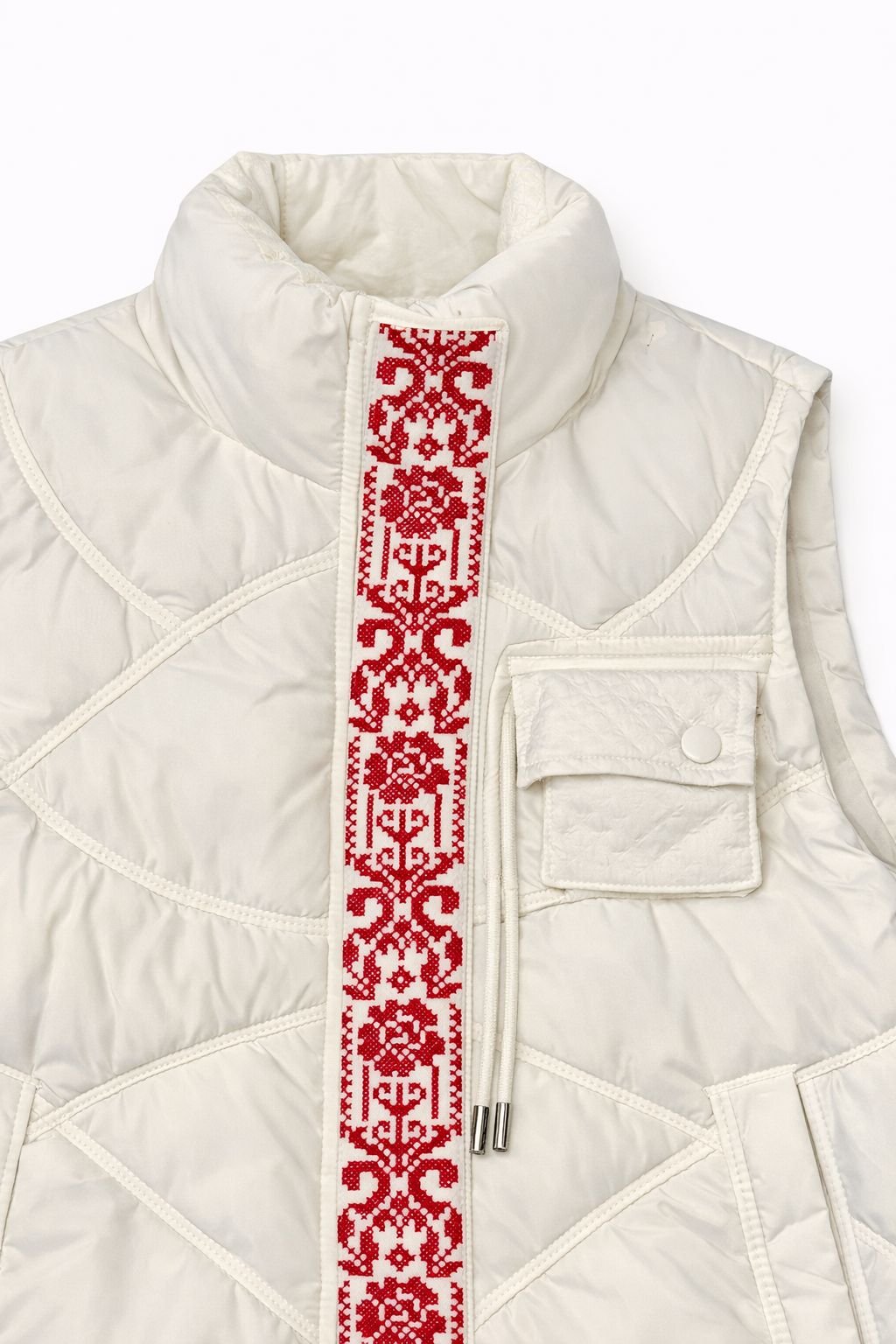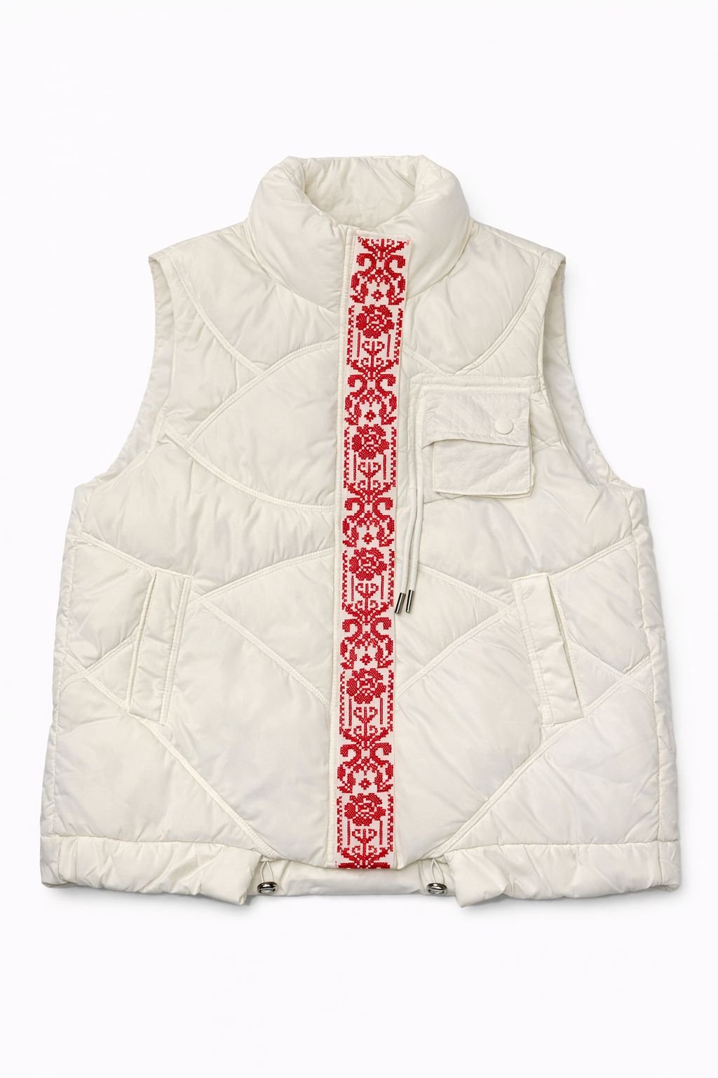 Premium ivory quilted vest with vertical red heritage embroidery, combining modern insulation with cultural craftsmanship.