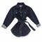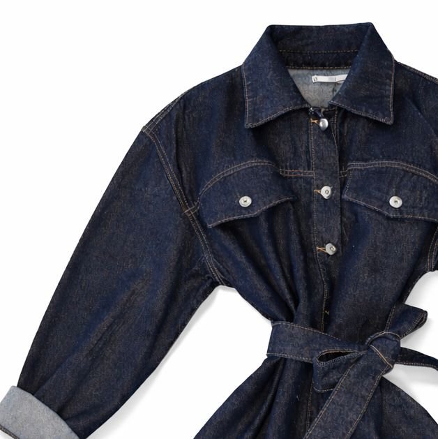 A modern essential crafted from rich dark-wash denim, this shirt jacket features a structured collar, classic button-front closure, and functional chest pockets. The adjustable tie waist defines the silhouette for a flattering fit, while rolled cuffs add a relaxed, contemporary touch. Versatile and effortlessly stylish, it can be worn as a lightweight jacket or styled as a statement shirt—perfect for everyday wear, layering, or casual chic looks.