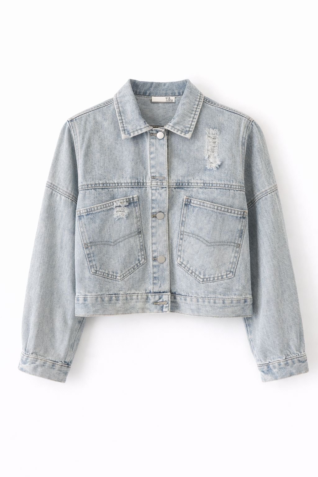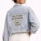 The back features a standout embroidered statement, adding personality and identity to the look, while subtle distressed details enhance its modern edge. The cropped cut and slightly relaxed fit make it perfect for layering over high-waisted outfits for a confident, fashion-forward vibe.