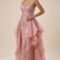 الجزء العلوي بقصة strapless مع تطريز فاخر بالكامل يعطي مظهر غني ومفصل، بينما الطبقات الانسيابية من الأورغانزا تضيف حركة فخمة وملكية مع كل خطوة. القصة الضيقة من الداخل تبرز الجسم، مع طبقات خارجية تعطي حجم وluxury presence.