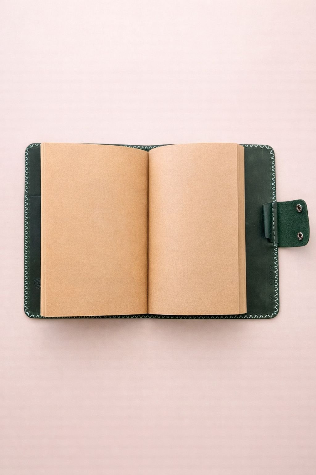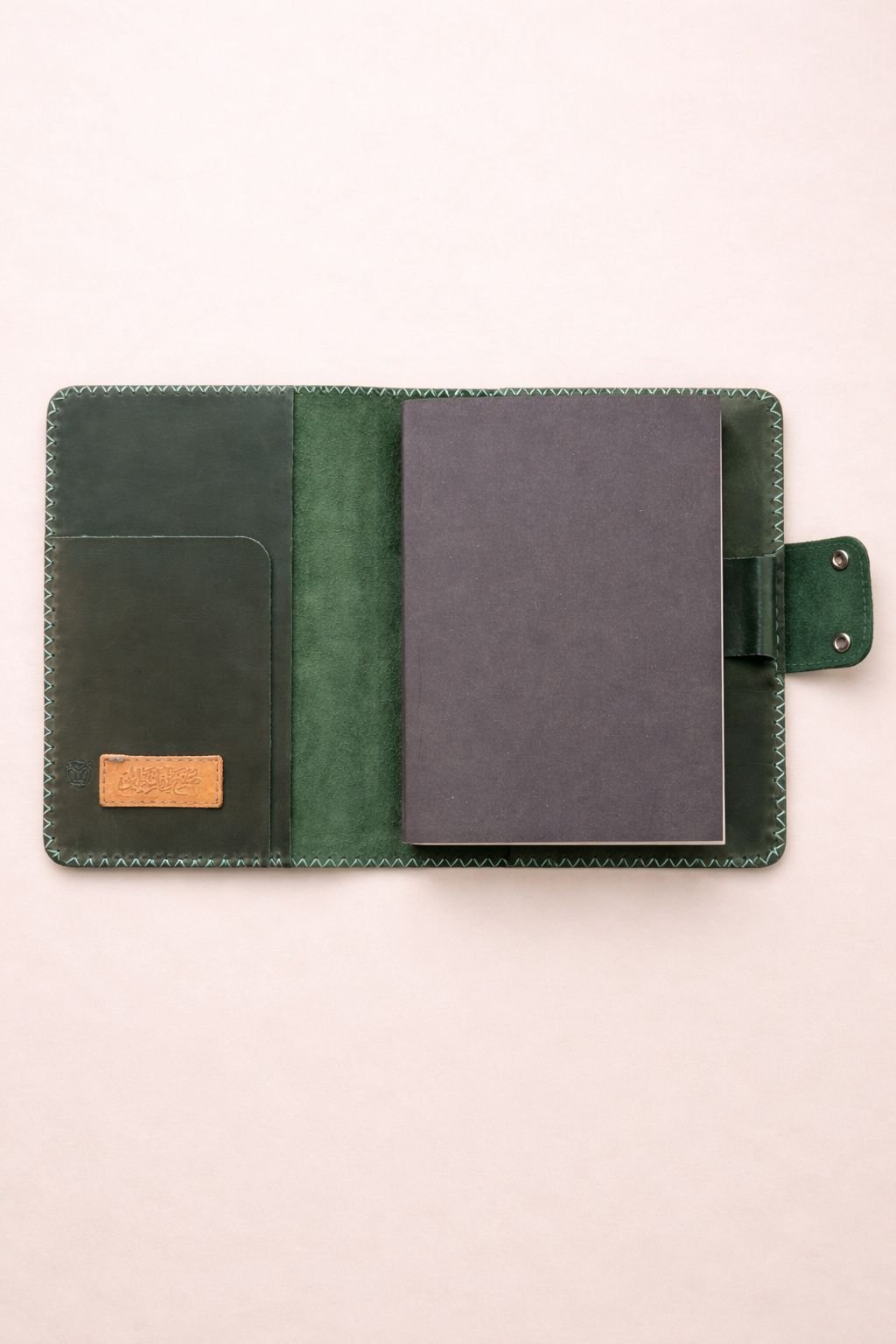 يتميز بتفاصيل خياطة يدوية بارزة تضيف طابع حرفي مميز، مع إغلاق عملي بزر معدني يحافظ على المحتوى بشكل آمن. تصميمه مثالي للاستخدام اليومي، سواء لتدوين الملاحظات، العمل، أو كقطعة شخصية تعكس أسلوبك.