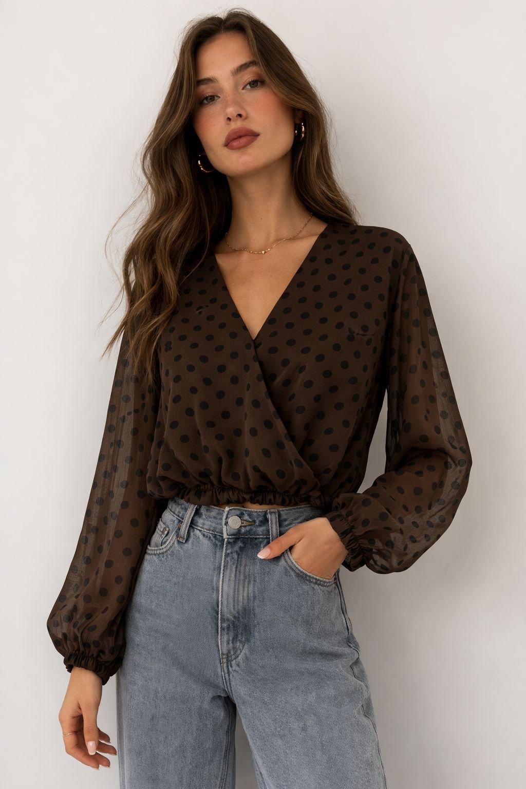 Elevate your everyday elegance with our Elegant Mocha Polka Dot Wrap Blouse. Designed in a rich mocha brown shade with classic black polka dots, this blouse blends femininity with refined sophistication.
