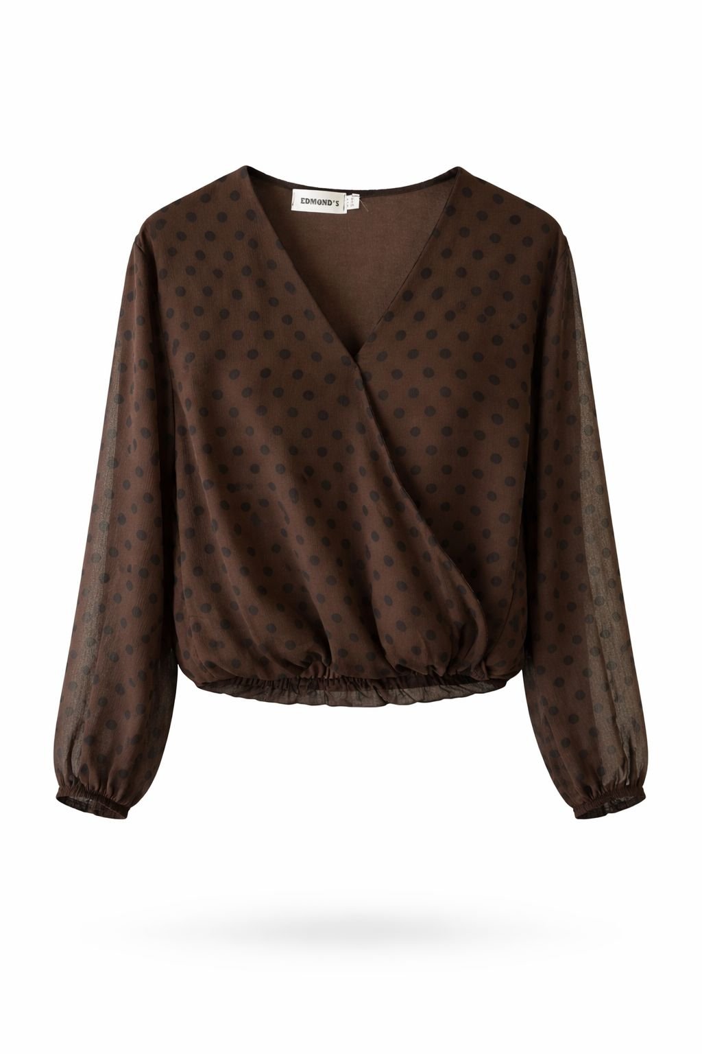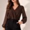 The flattering wrap-style V-neckline enhances the silhouette, while the soft, lightweight chiffon fabric offers a graceful flow and breathable comfort. Long sheer sleeves with elastic cuffs add a romantic touch, making it perfect for both office wear and evening styling.