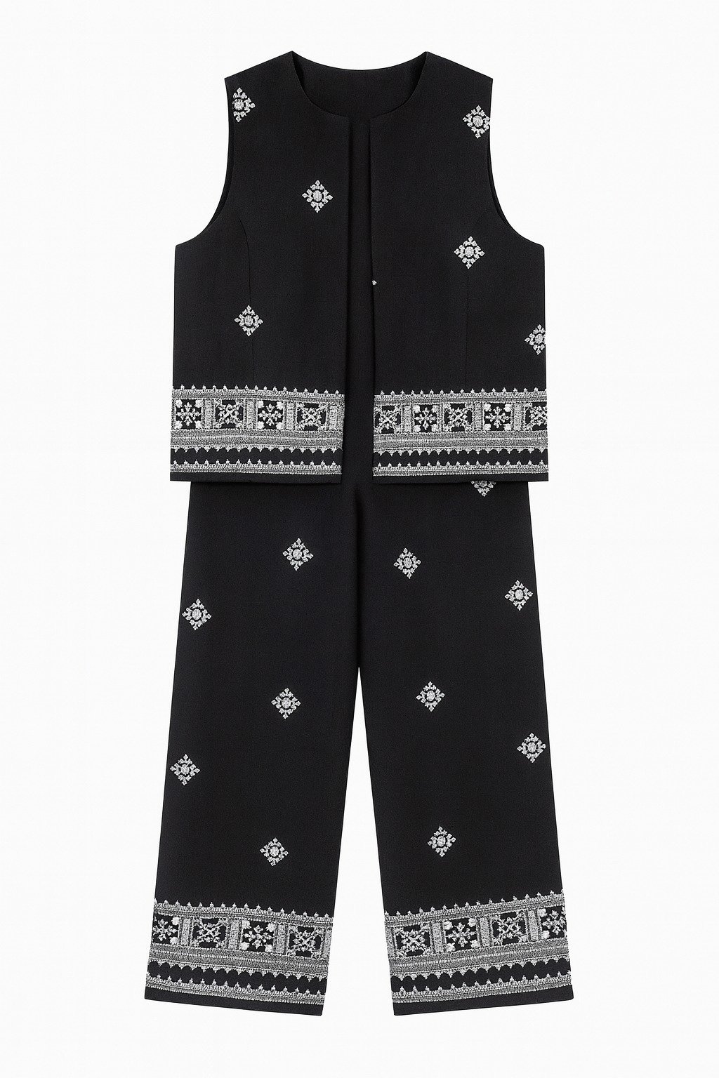 A traditional-inspired set in white and black, featuring a sleeveless top and wide-leg pants. The outfit is adorned with geometric embroidery patterns inspired by Palestinian heritage, symmetrically placed with embroidered borders highlighting the authentic details. A perfect blend of modern elegance and cultural roots.