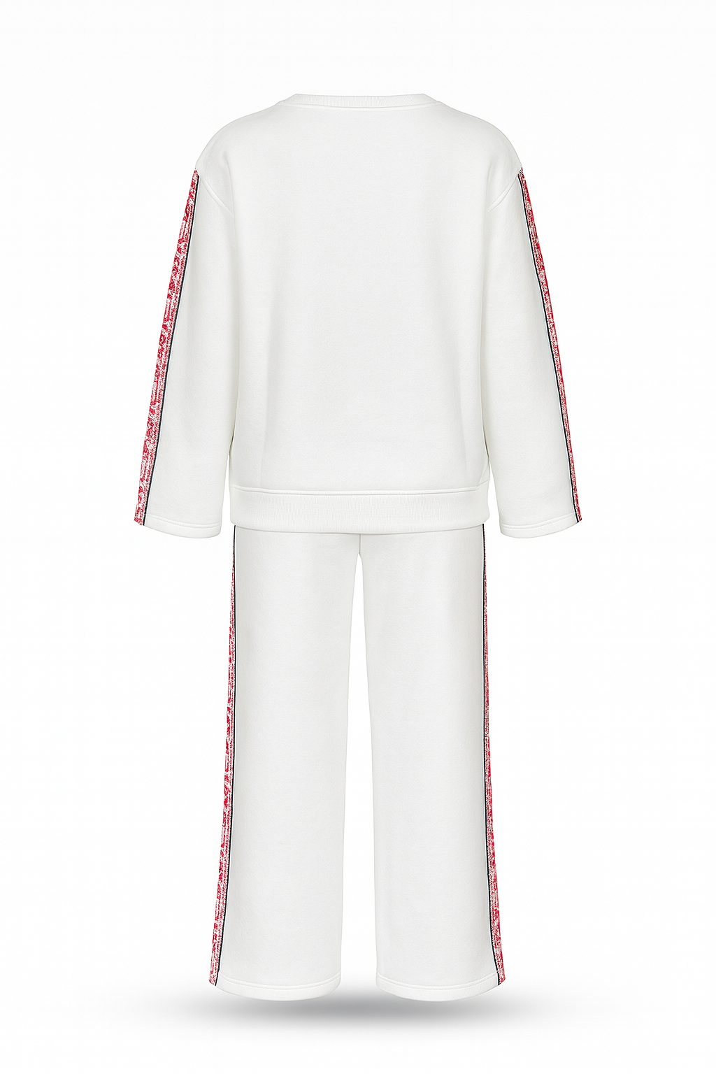 A refined white two-piece set featuring elegant red Palestinian embroidery along the sleeves and down the sides of the pants, blending simplicity, cultural identity, and comfort. Designed with a relaxed fit and crafted from soft, lightweight fabric, this set is perfect for everyday wear, campus, travel, and casual outings. The red embroidery adds a meaningful and stylish heritage touch to a clean, modern silhouette.