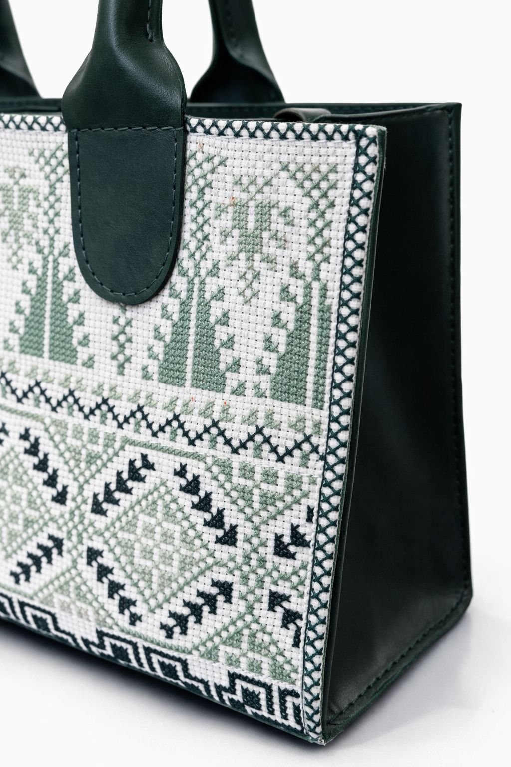 A refined structured tote featuring elegant green geometric embroidery inspired by traditional heritage patterns, paired with deep forest-green leather sides and handles. This bag combines timeless craftsmanship with a modern silhouette, offering a calm, luxurious aesthetic that feels both cultural and contemporary. Designed for daily elegance, it’s spacious, sturdy, and perfect for work, shopping, or sophisticated everyday wear — a graceful balance of tradition and modern luxury.