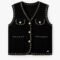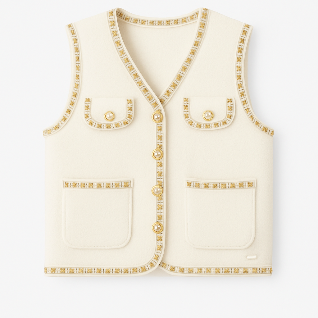 A sophisticated vest featuring an elegant classic design with gold-trim detailing that adds a refined, luxurious touch. It comes with a straight fit, a V-neckline, and gold-tone buttons for a polished look, along with practical front pockets accented with matching embroidered details. Perfect for layering over winter or semi-formal outfits to elevate your style effortlessly.