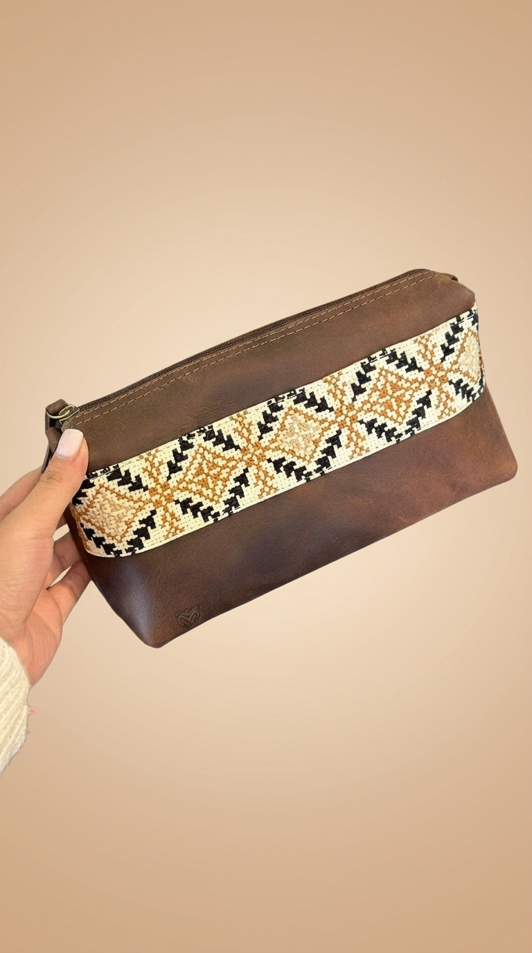 تصميم يجمع بين الحرفية التقليدية والفخامة العصرية. تأتي الحقيبة الجلدية المطرزة – التراث مصنوعة من جلد طبيعي فاخر بملمس غني، مع شريط تطريز طولي مستوحى من النقوش الفلسطينية الأصيلة يمنح القطعة طابعًا مميزًا وفريدًا.