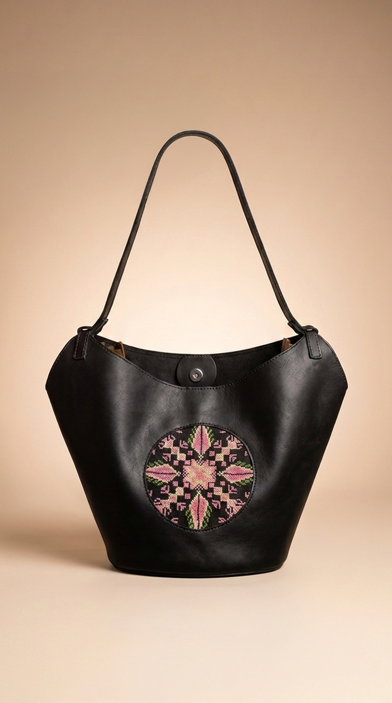 تصميم عصري بلمسة تراثية فاخرة. تأتي حقيبة الكتف الجلدية المطرزة – التراث مصنوعة من جلد طبيعي عالي الجودة بملمس ناعم ومتين، مع تطريز مركزي مستوحى من النقوش الفلسطينية الأصيلة يمنحها حضورًا مميزًا.