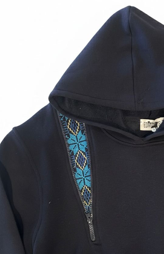 A premium adult hoodie designed with a clean, modern silhouette and a refined cultural touch. Crafted in a deep navy tone, this piece is elevated by a subtle heritage-inspired embroidered accent along the shoulder line, adding character without overpowering the minimalist design.