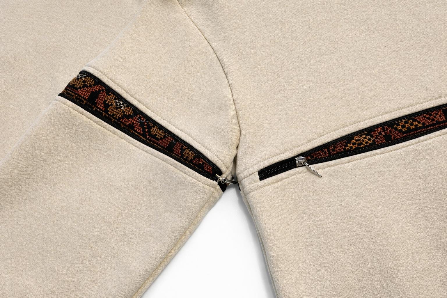 This premium adult sweatshirt combines contemporary design with refined cultural craftsmanship. Designed in a soft beige tone, it features a distinctive horizontal heritage-pattern zip detail across the chest and sleeves, creating a unique visual signature that elevates a classic silhouette into a statement piece.
