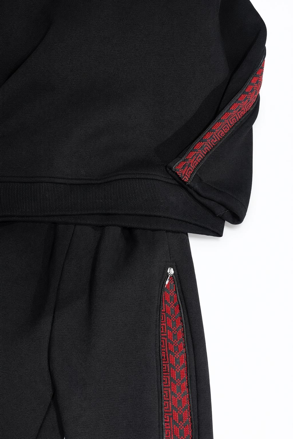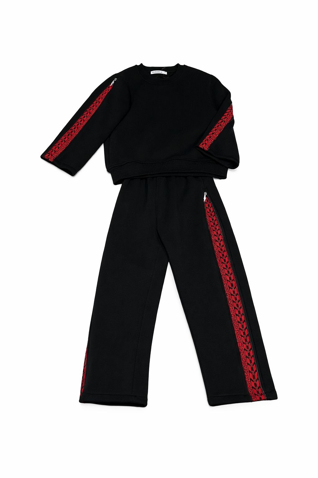 This premium kids’ two-piece tracksuit set blends modern minimalism with cultural elegance. Designed in a classic black color, it features refined traditional patterned side stripes in rich red tones along the sleeves and pants, creating a bold and distinctive contrast.