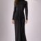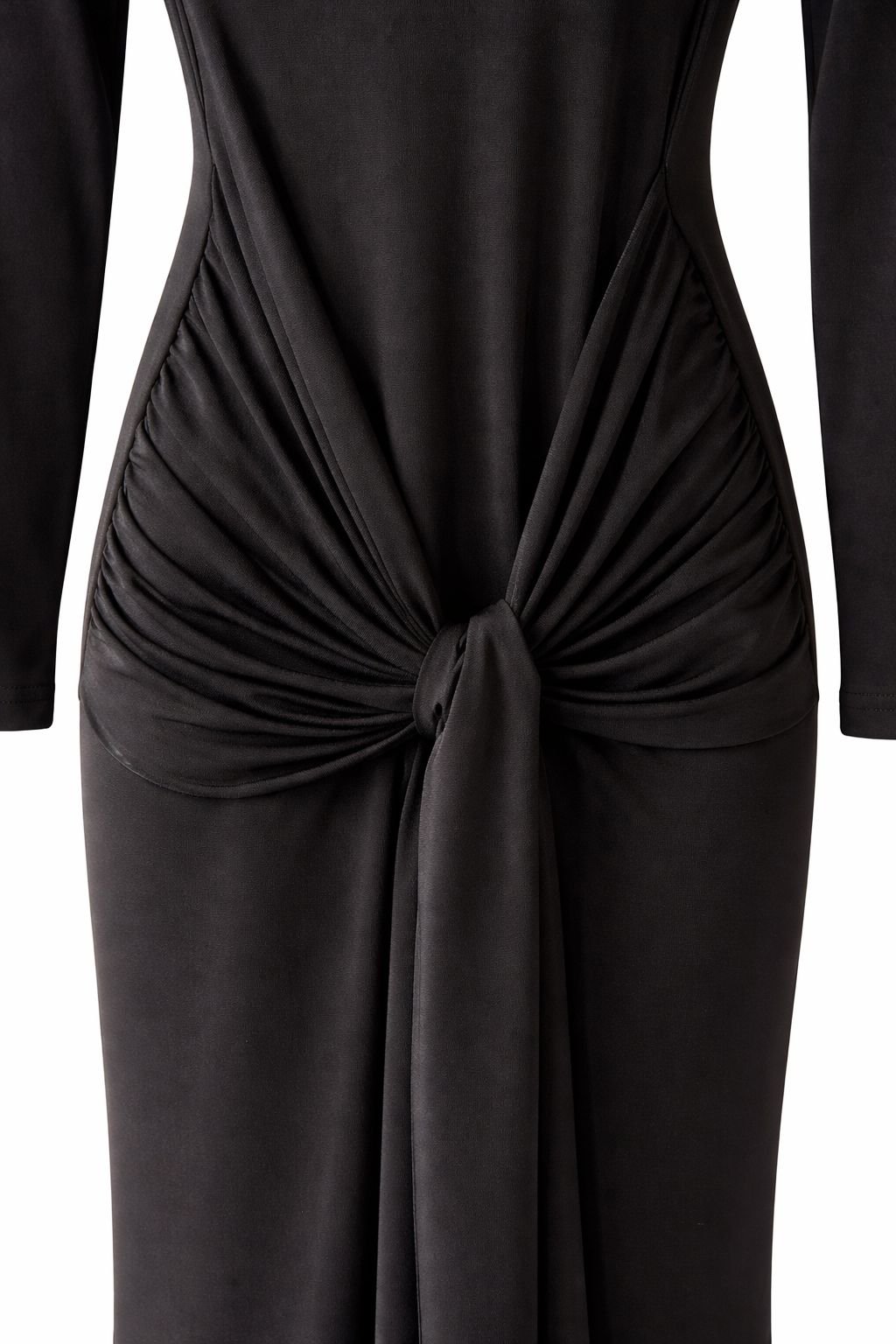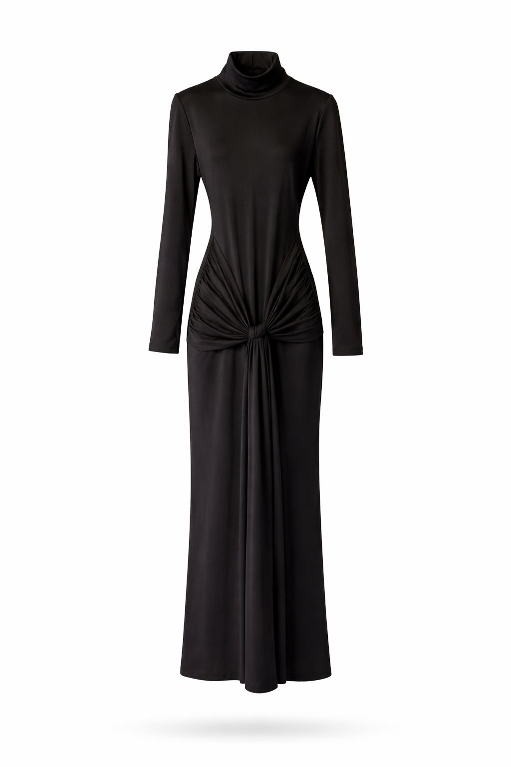 The high neckline and long sleeves create a sophisticated, modest balance, while the gathered knot detail at the waist adds definition and a soft draped effect that flows beautifully down the skirt. The subtle front drape elongates the figure, giving this piece a graceful and statuesque presence.
