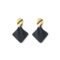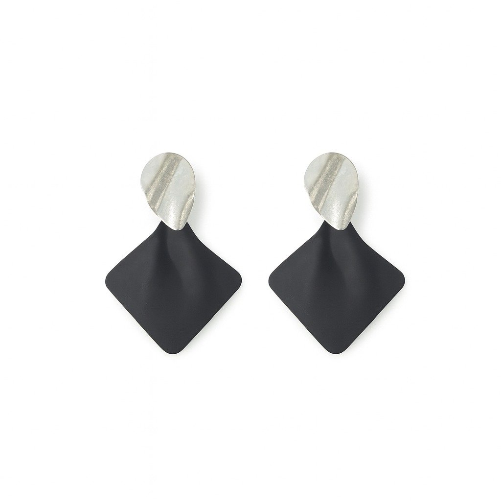 Artistic modern earrings featuring a golden teardrop-shaped stud with distinctive stripes, paired with a matte black geometric diamond-shaped drop. A bold design that adds a contemporary and elegant touch to any look.