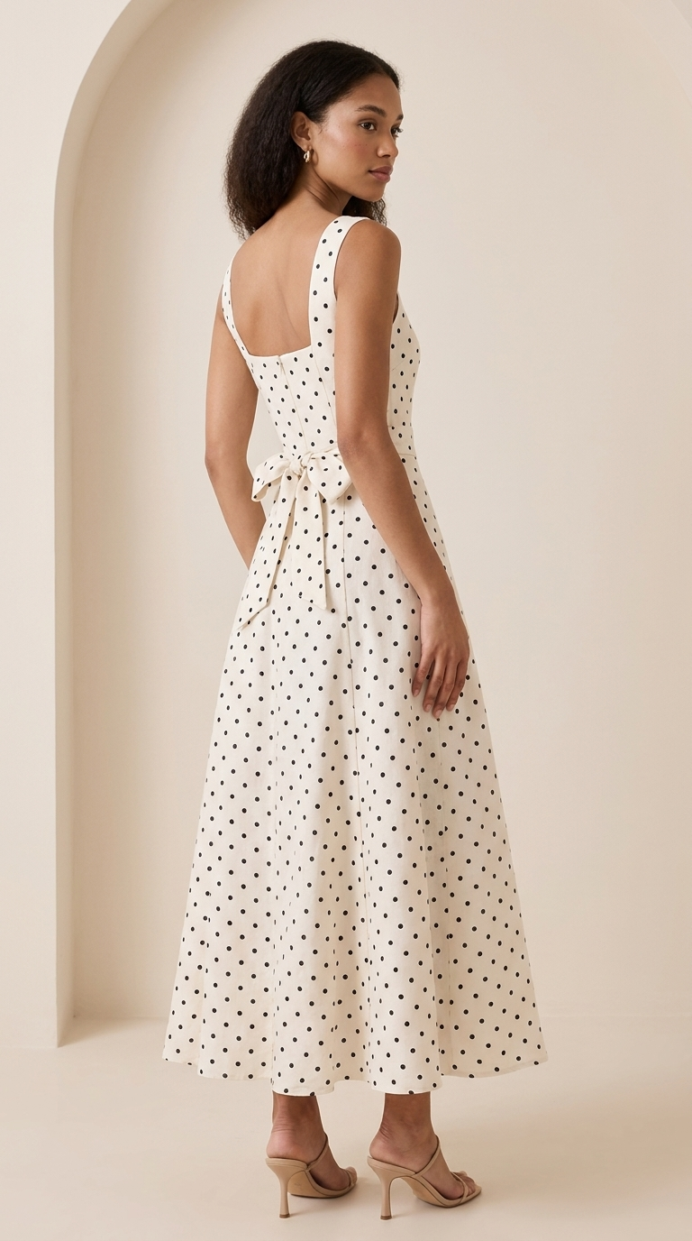 The Polka Bow Midi Dress features a flattering fitted bodice with a classic polka dot pattern, flowing into a voluminous skirt for graceful movement. Finished with a delicate bow tie at the back, it adds a romantic touch — perfect for summer occasions and elegant daytime looks.