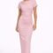Crafted from soft, stretch-enhanced fabric, this blush pink midi dress features delicate ruching along the waist and side, creating a beautifully contoured silhouette. The draped neckline adds a sophisticated touch, while the fitted design enhances natural curves with subtle elegance.