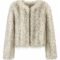 A luxurious short faux fur jacket in an ivory shade with a chic lynx-inspired dotted pattern. Soft, warm, and perfect for stylish winter outfits.