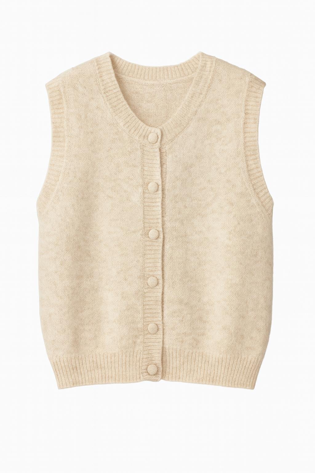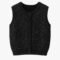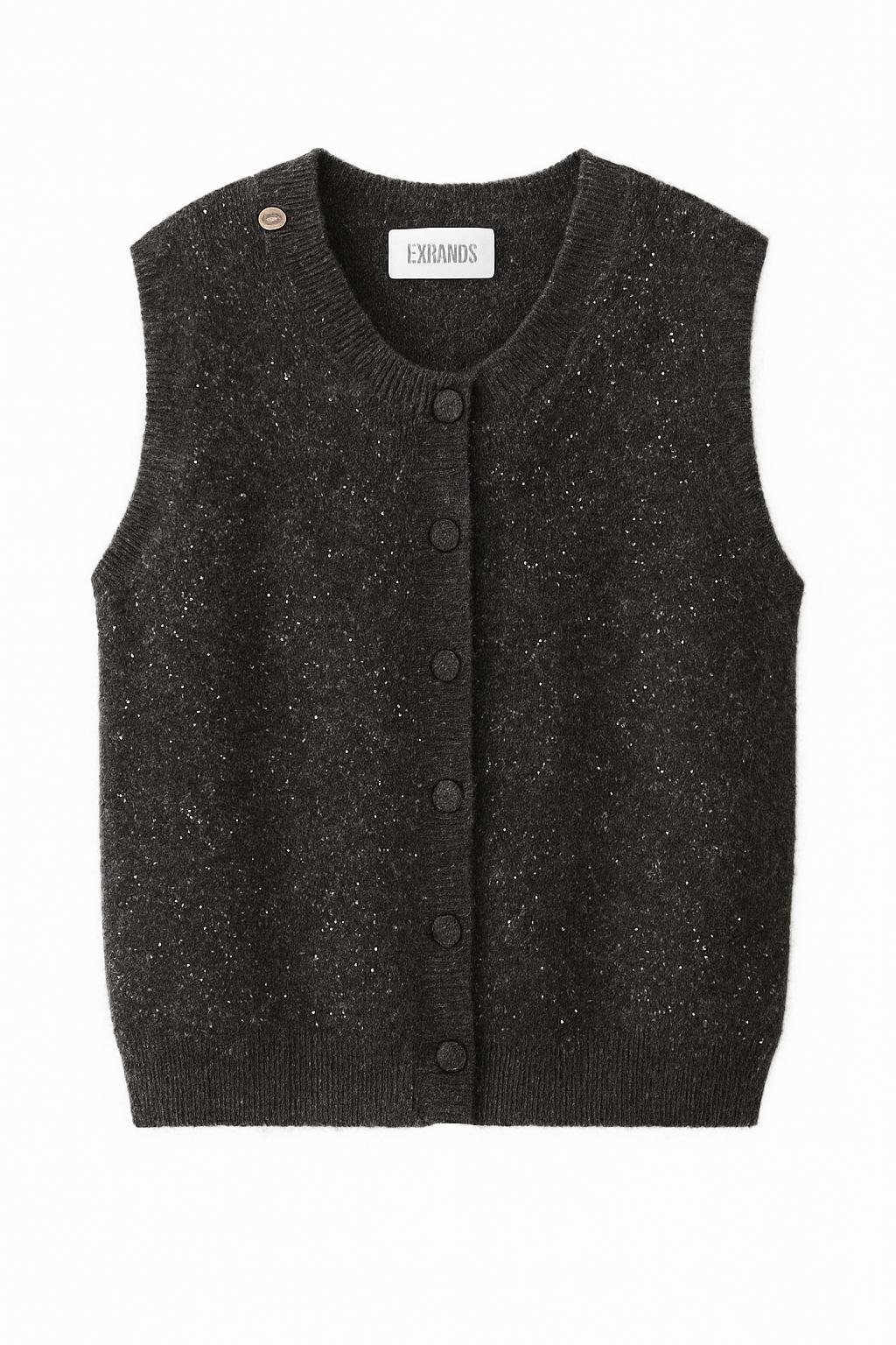 A stylish black knitted vest featuring subtle sparkly threads for an elegant, eye-catching look. Designed with a straight fit and fabric-covered buttons for a clean, polished finish. Its soft, comfortable texture combined with the delicate shimmer makes it perfect for evening outfits or chic elevated casual styles.