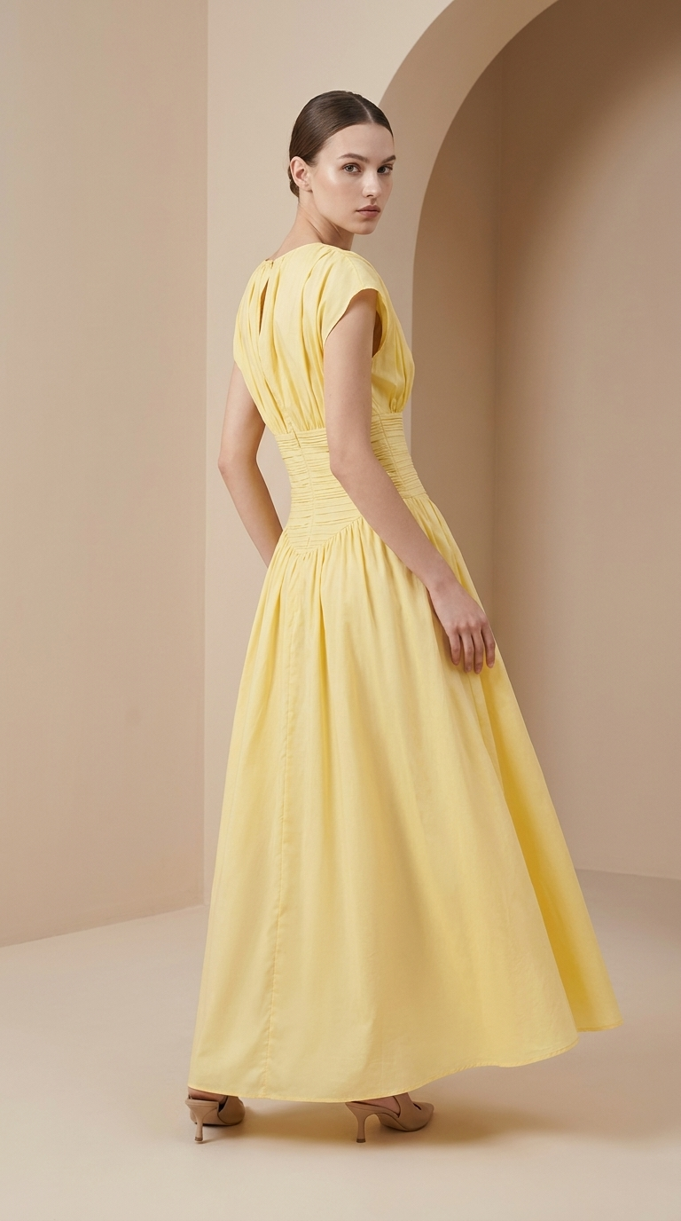 فستان بلون أصفر دافئ يتميز بتفاصيل كسرات ناعمة في الجزء العلوي مع خصر محدد يعطي شكل جذاب، وتنورة واسعة بانسيابية تمنح حركة خفيفة وأنيقة مثالية لفصل الصيف.