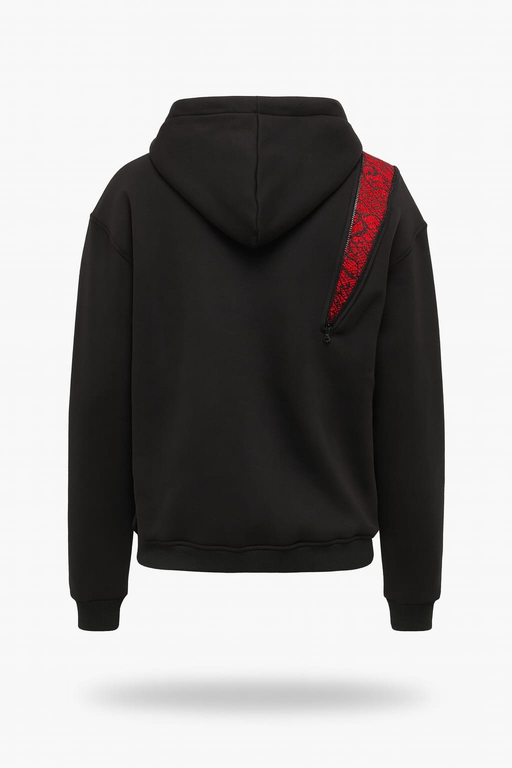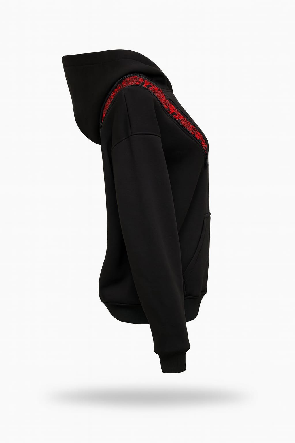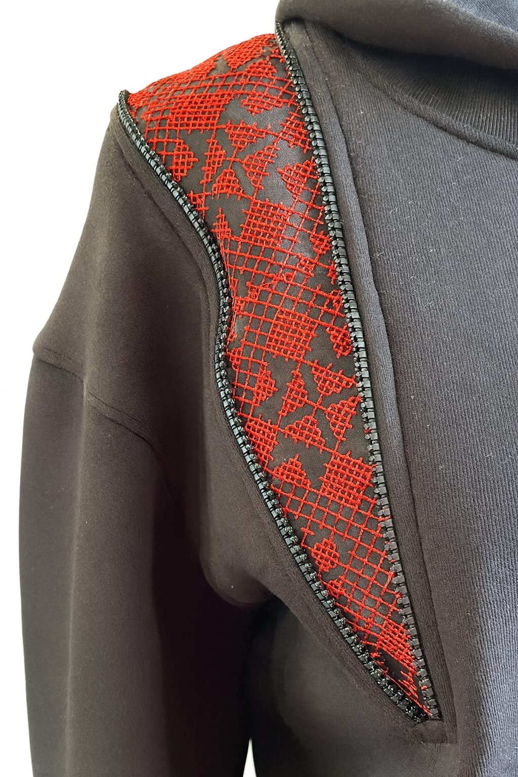 Black hoodie combining comfort and Palestinian heritage, featuring authentic red tatreez embroidery on the shoulder for a unique elegant touch. Made of premium soft cotton with a hood and front pocket for a stylish and comfortable everyday look.