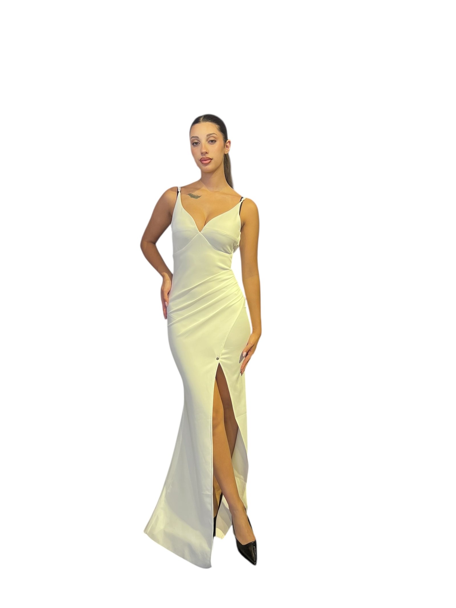 A long evening gown in white, featuring a form-fitting silhouette and a high front slit for an elegant, captivating look. It has thin spaghetti straps and a sweetheart neckline, with subtle pleated fabric details for a luxurious finish .