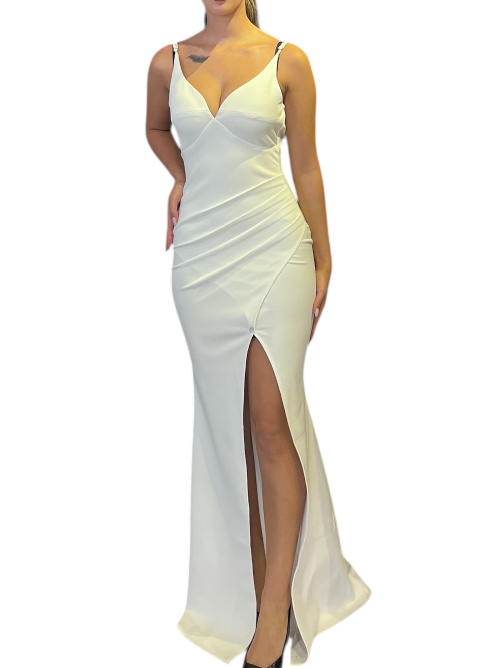 فستان سهرة طويل باللون الأبيض، يتميز بقصة ضيقة تبرز القوام، مع شق أمامي طويل عند الساق لإطلالة أنيقة وجذابة. يحتوي على حمالات رفيعة وتصميم صدر على شكل قلب، مع تفاصيل كسرات خفيفة في القماش تمنحه لمسة فاخرة.